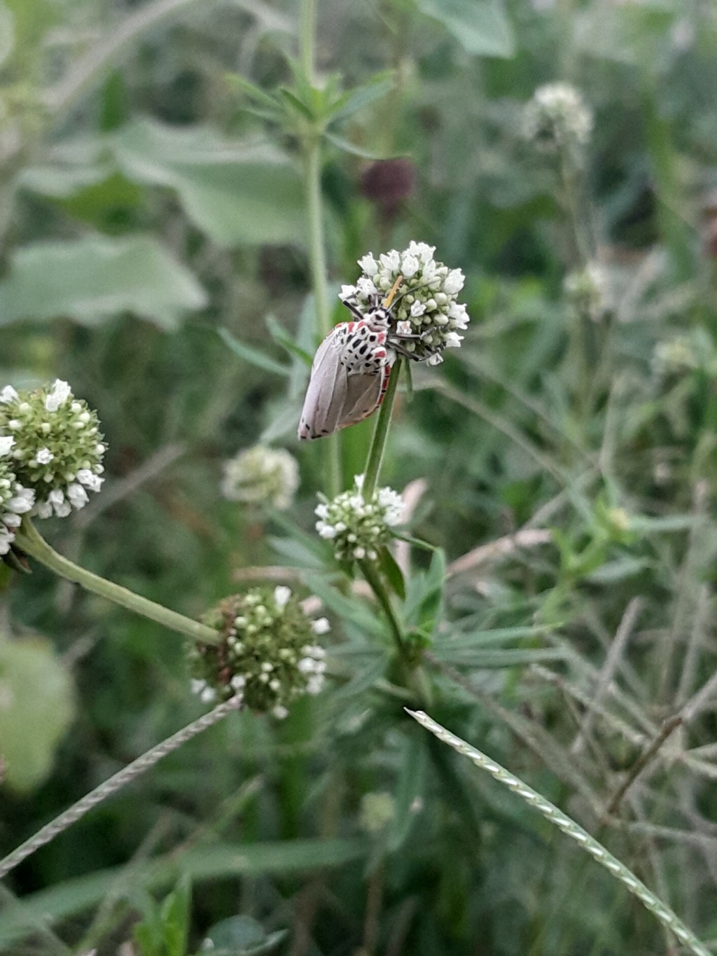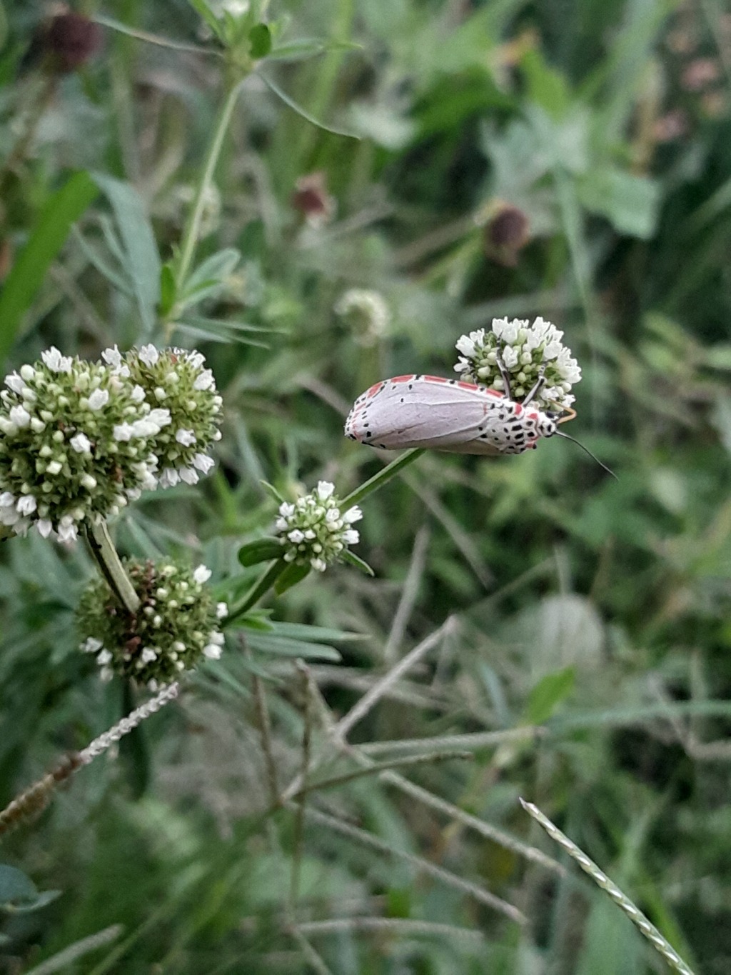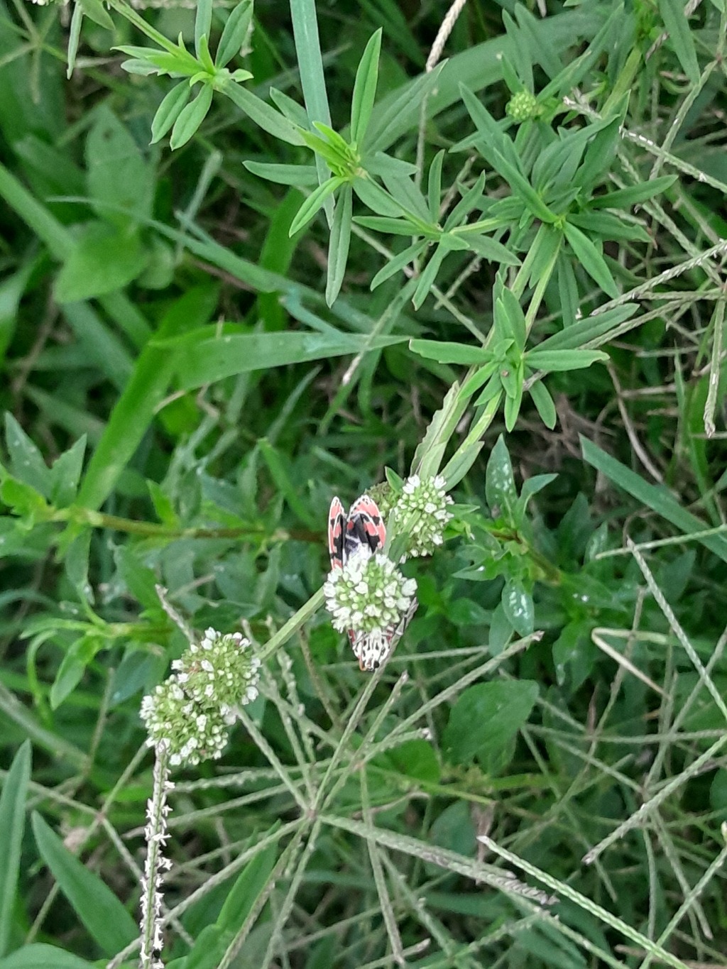| r0000002241 Loc.: R.Adriano Melo Santana, Nossa Senhora da Glória, Sergipe, Brazil Coords.: [NaN,NaN] Observado por: Fernanda estefany Cruz Silveira Data: 07-abr-2026 16h - 18h Enviado em: 08-abr-2026 Notas: A planta é conhecida no Brasil como erva-de-botão(nome científico:Spermacoce verticillata), ela é atrativa para pequenos polinizadores, como abelhas e borboletas. O animal é uma mariposa conhecida popularmente como maripos-teia-de-veludo o nome científico é Utetheisa ornartrix. Ela é fácil de identificar por causa dos seus padrões únicos. É multualismo por meio da polinização. A mariposa ganha alimento (néctar) e a planta consegue se reproduzir ao ter seu pólen transportado. Ambos se beneficiam. | ||||